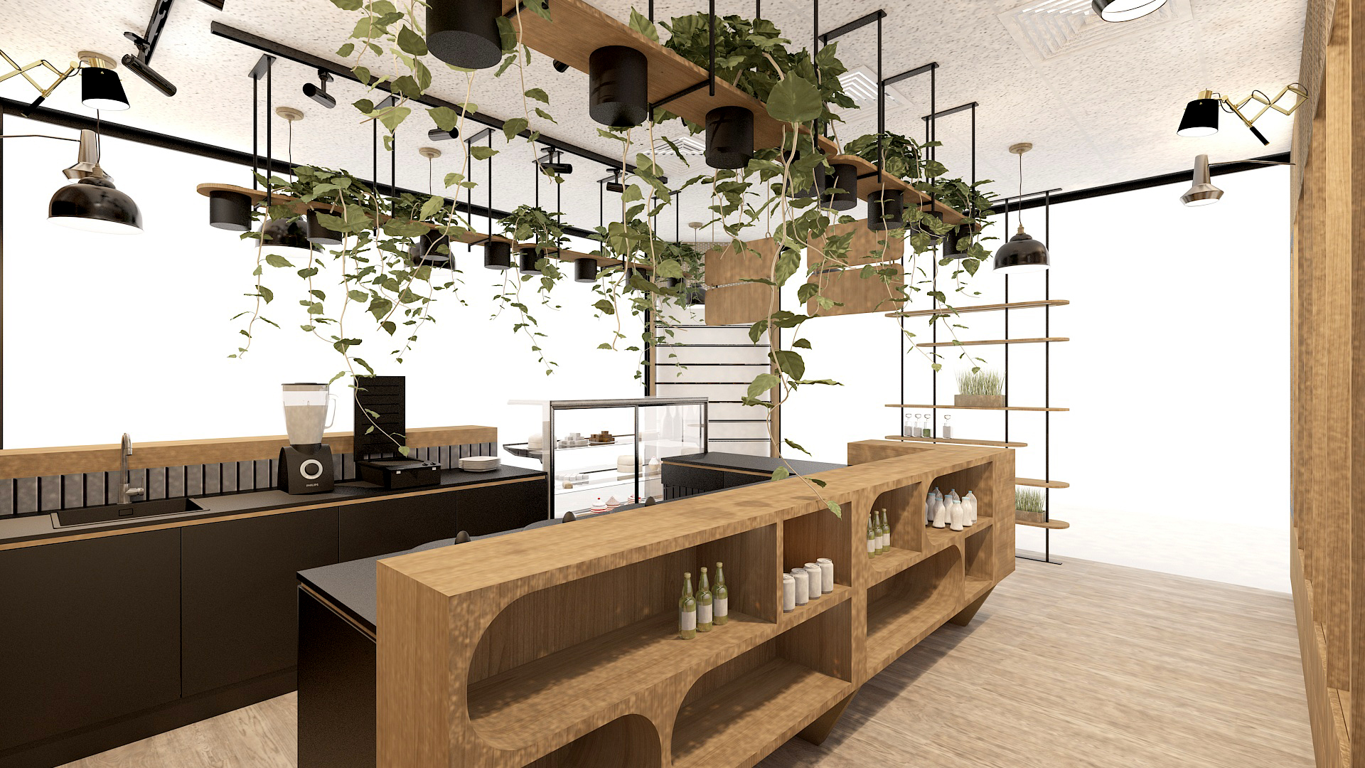 The space imagined for the naturist brand "Remediu" tested a corner location in a shopping center gallery in Bucharest. To exhibit and sell supplements, therapeutic bee products (made in Romania) and at the same time to sell and serve confectionery products with beekeeping ingredients. The proposed layout consists of two "L" sides equipped with display furniture, a peninsula attached to one of the sides and an isolated corner, provided with an exhibition box, at the base of an add screen, posed on a pole with a triangular base, which marks, like a totem, the intersection of the two commercial galleries.